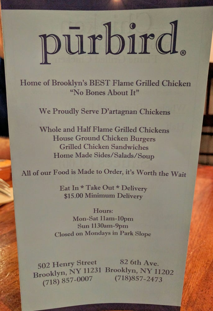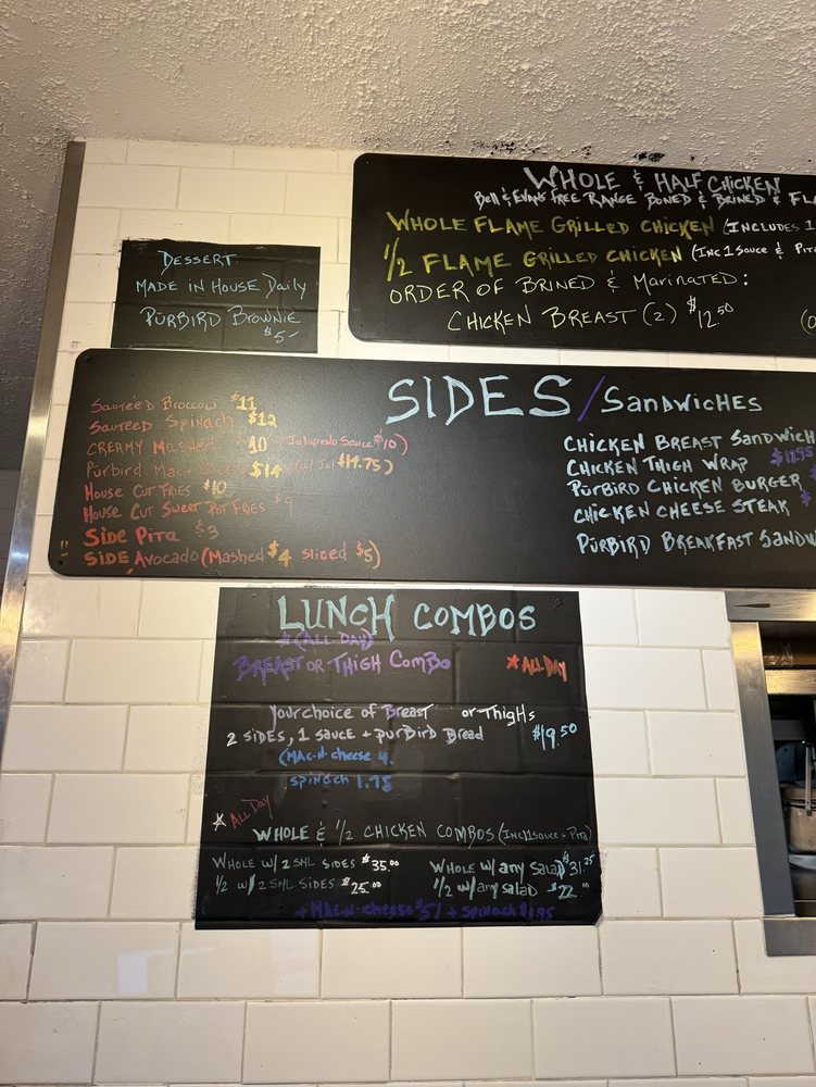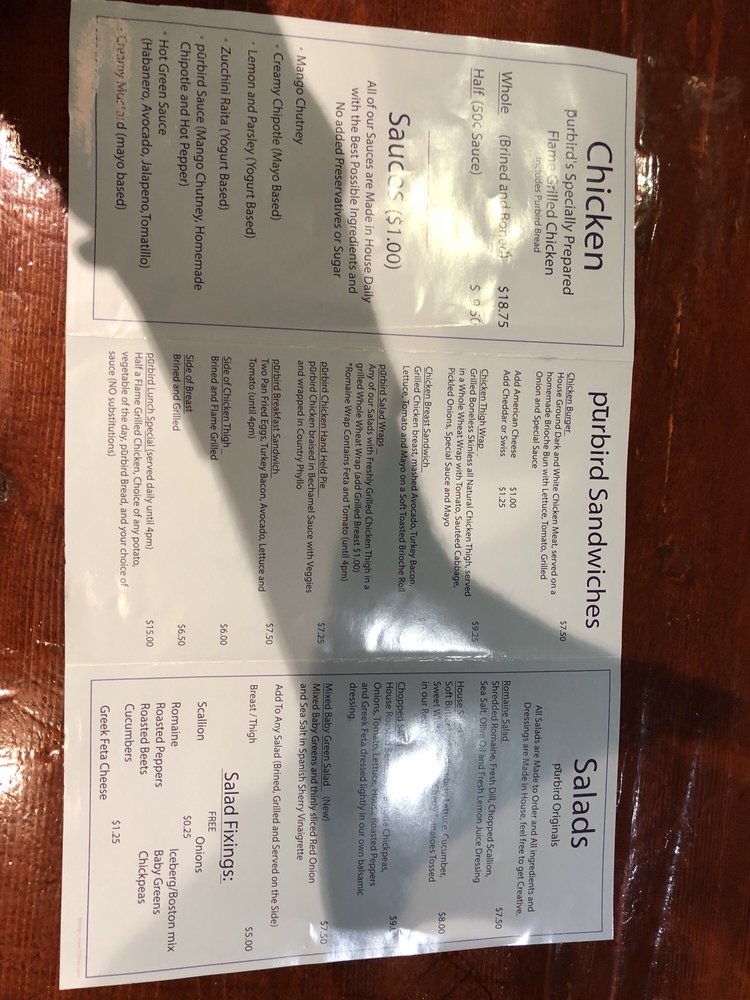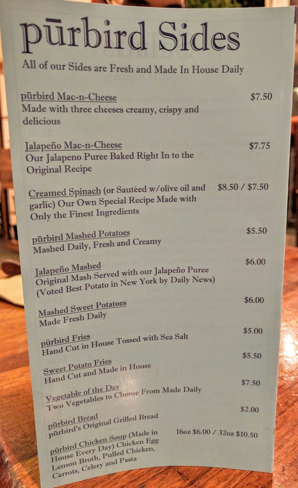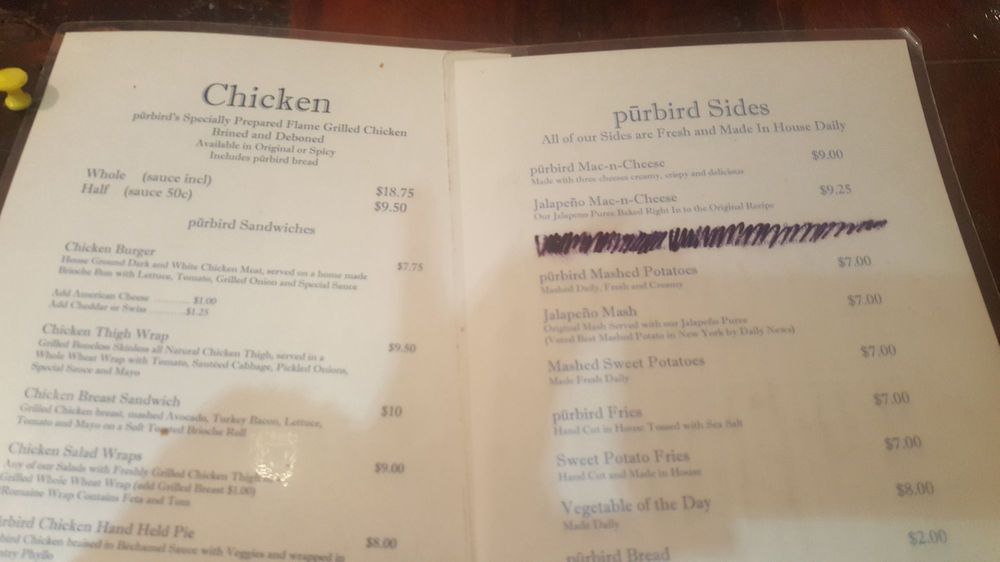 Introducing Purbird, a renowned chicken shop in Brooklyn, NY, offering a menu filled with delicious New American cuisine. Known for their juicy flame-grilled chicken, Purbird also provides a variety of sides, sauces, and freshly baked bread. Customers rave about the lunch specials, with options like chicken breast and garlic broccoli. The mac and cheese, spicy chicken sandwich, and jalapeno mac are highly recommended by patrons. With a range of vegetarian options, street parking, and free Wi-Fi, Purbird is a convenient and popular choice for lunch or dinner. The classy yet casual ambiance, along with the excellent service, makes dining at Purbird a delightful experience for all. Don't miss out on the flavorful dishes and welcoming atmosphere at this gem of a restaurant.