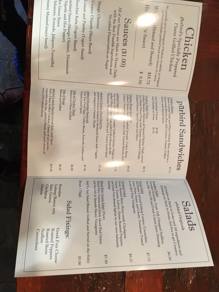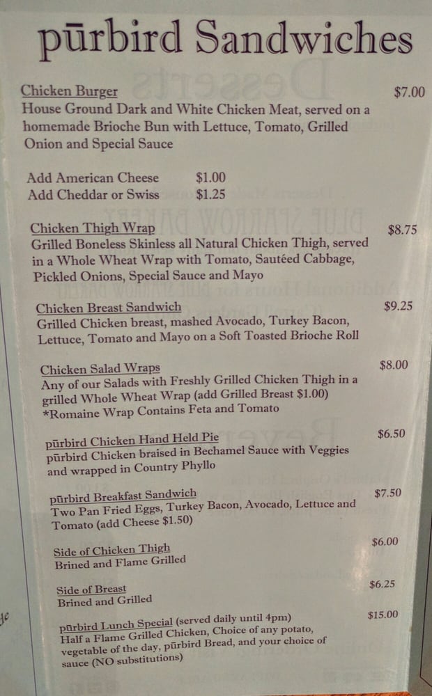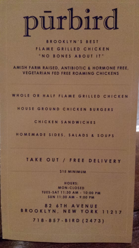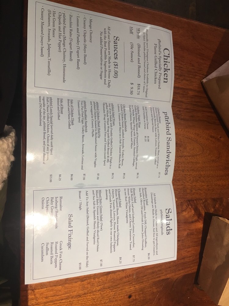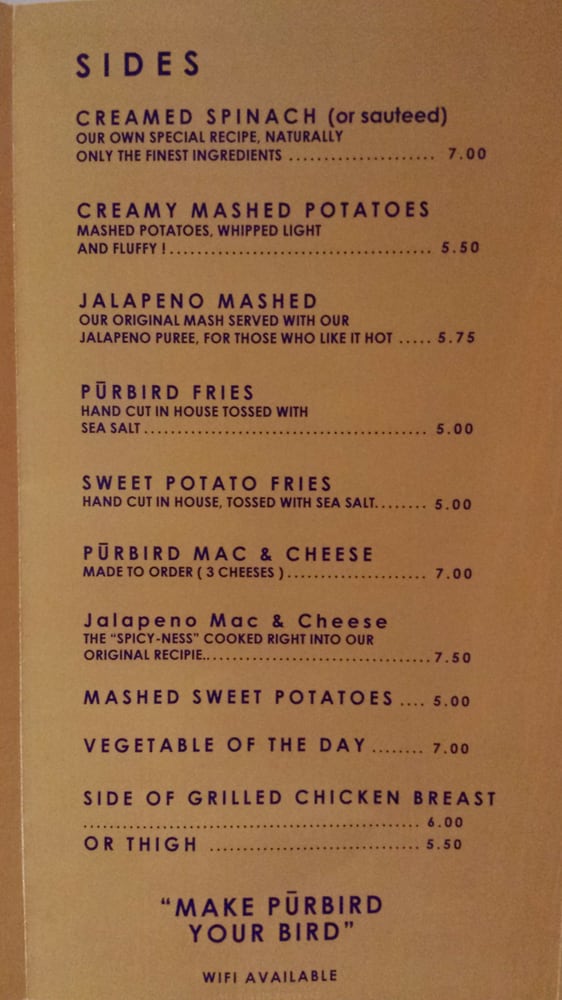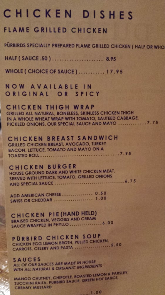 Introducing Purbird, a renowned chicken shop in Brooklyn, NY, offering a menu filled with delicious New American cuisine. Known for their juicy flame-grilled chicken, Purbird also provides a variety of sides, sauces, and freshly baked bread. Customers rave about the lunch specials, with options like chicken breast and garlic broccoli. The mac and cheese, spicy chicken sandwich, and jalapeno mac are highly recommended by patrons. With a range of vegetarian options, street parking, and free Wi-Fi, Purbird is a convenient and popular choice for lunch or dinner. The classy yet casual ambiance, along with the excellent service, makes dining at Purbird a delightful experience for all. Don't miss out on the flavorful dishes and welcoming atmosphere at this gem of a restaurant.